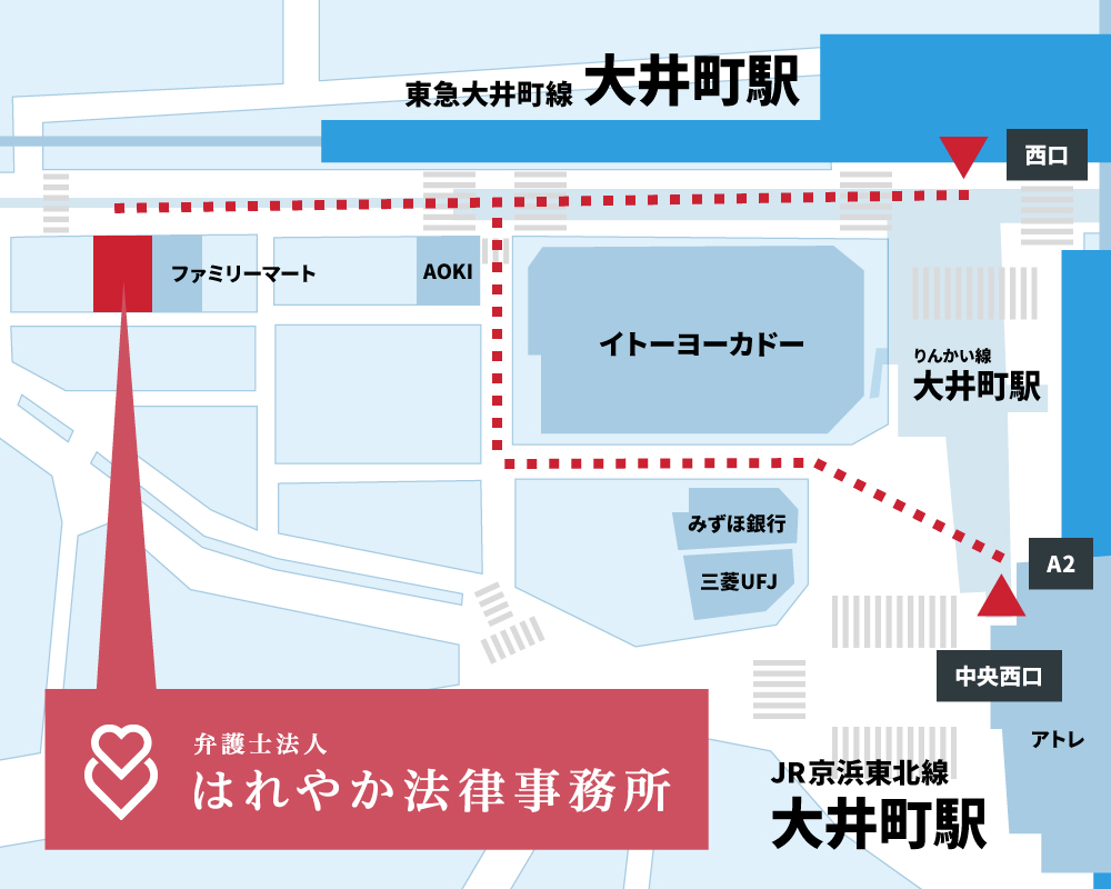 夜間・土日対応可私たちの法律事務所は、最寄りの「大井町駅」から徒歩2分の好立地にあります。「大井町駅」は京浜東北線・大井町線・りんかい線の3路線と接続しているため、「品川駅」「東京駅」「横浜駅」「池袋」「新宿駅」「渋谷駅」などからは抜群のアクセスです。